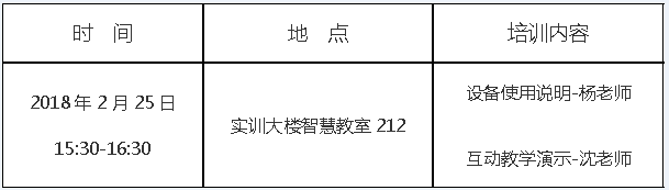 教务处教师教学发展中心于2017年新建了3间智慧教室,该教室建设采用了全新的设备和授课平台,具有教学互动问答、课程实景录播、设备智能控制等多功能用途。为了帮助老师们了解和掌握智慧教室的使用技巧,教师教学发展中心计划组织一次智慧教室使用技术的培训,请各学院教学秘书通知本学期在智慧教室上课的任课老师(名单见附件)准时参加,其他有兴趣的老师明天上午10点前报名可共同前往指定地点参加培训。